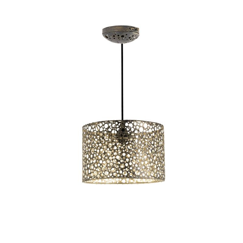 Lámpara suspendida con 1 caida. Incluye tulipa de hierro tallado en forma de Cilindro S 30cm Ø y plafón redondo de 12cm de diámetro de hierro tallado, con casquillo EIVA IP65 (montado), resistente al agua. Cable a la medida deseada.