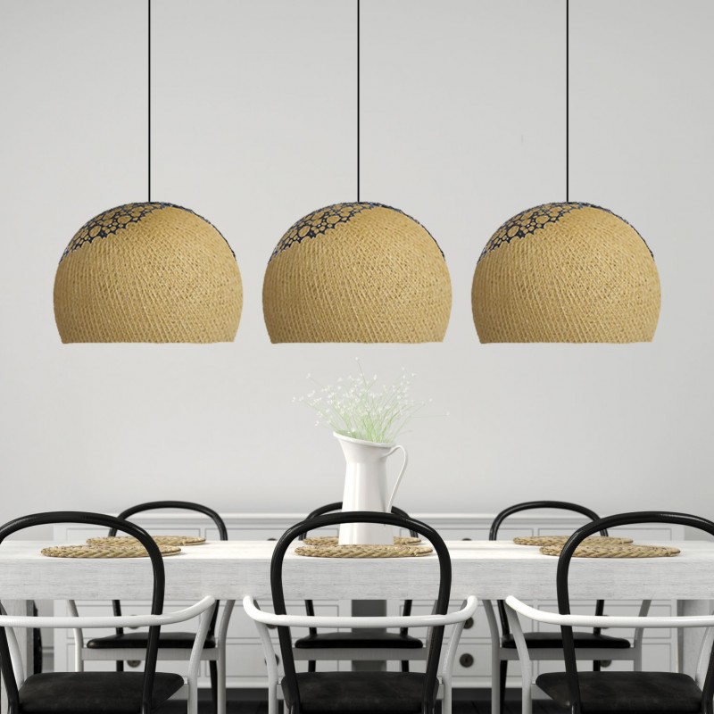 Lámpara suspendida triple. Incluye tulipas de hilo de algodón tailandés en forma de Cúpulas de 35cm Ø con embellecedor Desi y plafón rectangular de 90cm de hierro tallado. Cable a la medida deseada.