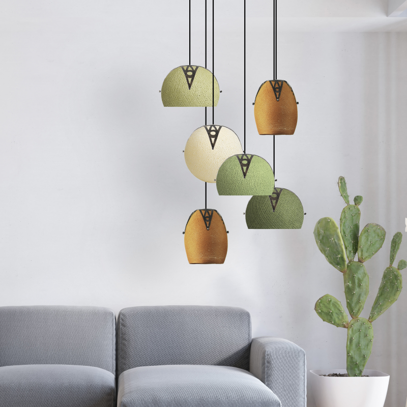 Lámpara suspendida con 6 caidas. Incluye tulipas de hilo de algodón tailandés en forma de Bolas de 22cmØ, Cúpulas de 22cmØ y Cocoon S 20cm altura con embellecedor Kuno y plafón redondo de 35cm Ø de hierro tallado. Cable a la medida deseada.