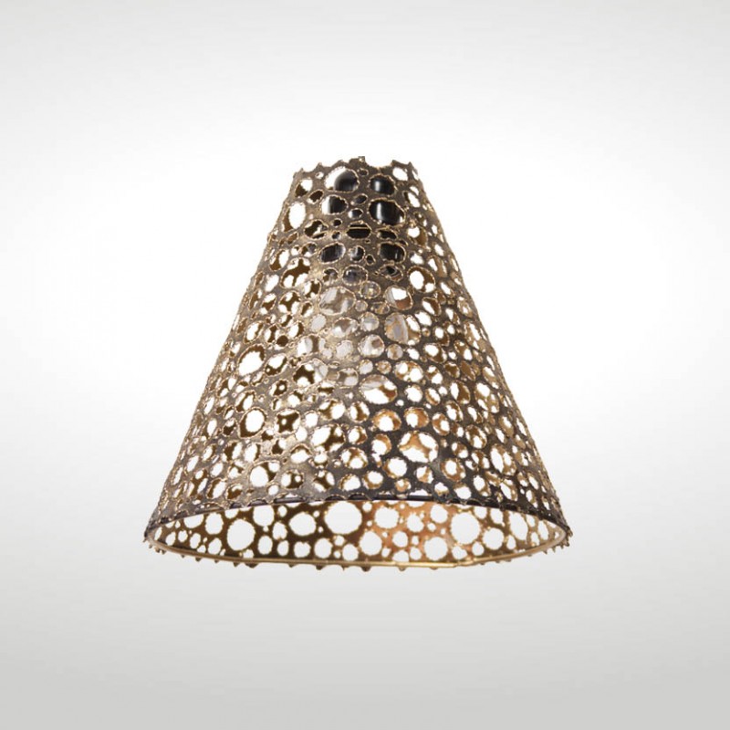 Cada una de ellas está tallada y soldada mediante soplete de acetileno, presentando irregularidades que les hacen ser objetos únicos y originales. El interior de cada tulipa puede ser negro o dorado, proporcionando calidez al entorno.