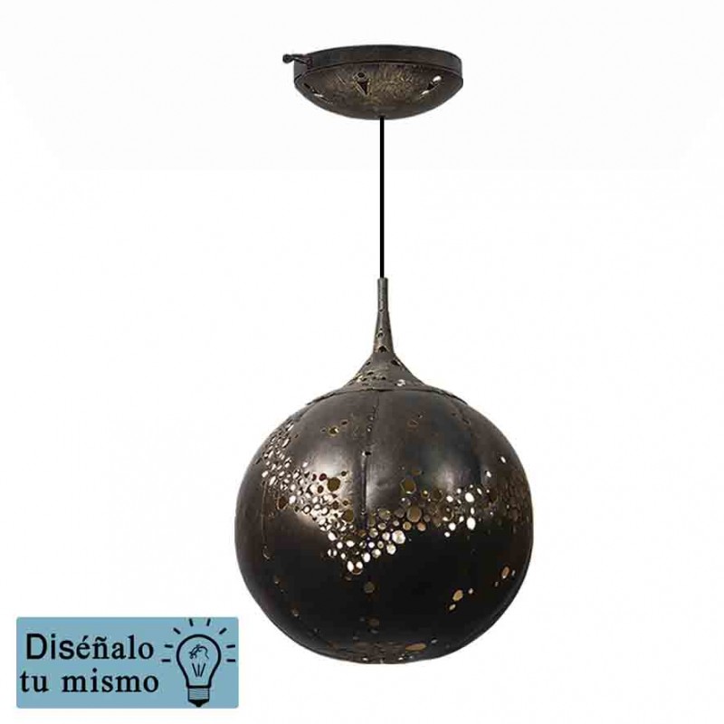 Lámpara suspendida con tulipa de hierro tallado a mano de 30 cm de diámetro con plafón de 20 cm.